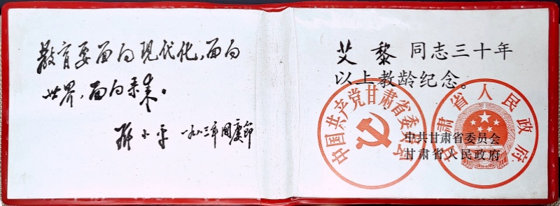 這是一本從教滿三十年的榮譽證書。由中共甘肅省委、甘肅省人民政府頒發。證書內頁的左側是鄧小平1983年國慶節題寫的“教育要面向現代化,面向世界,面向未來”。右側是“艾黎同志三十年以上教齡紀念”。“三個面向”是為北京景山學校的題詞,是鄧小平提出的教育發展改革方針,旨在推動中國的教育現代化進程,使其更加開放和適應未來發展的需要,面向世界,吸收國際先進的教育理念和經驗;同時展望未來,培養適應未來社會需要的人才。