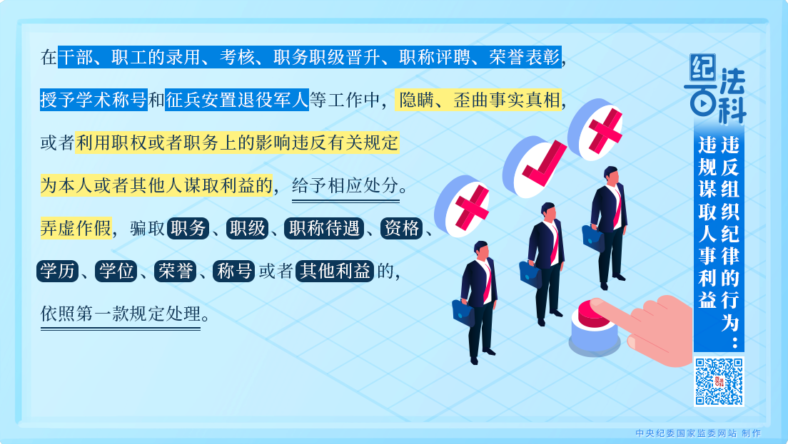 第一款規定,在干部、職工的錄用、考核、職務職級晉升、職稱評聘、榮譽表彰,授予學術稱號和征兵安置退役軍人等工作中,隱瞞、歪曲事實真相,或者利用職權或者職務上的影響違反有關規定為本人或者其他人謀取利益的,給予相應處分。