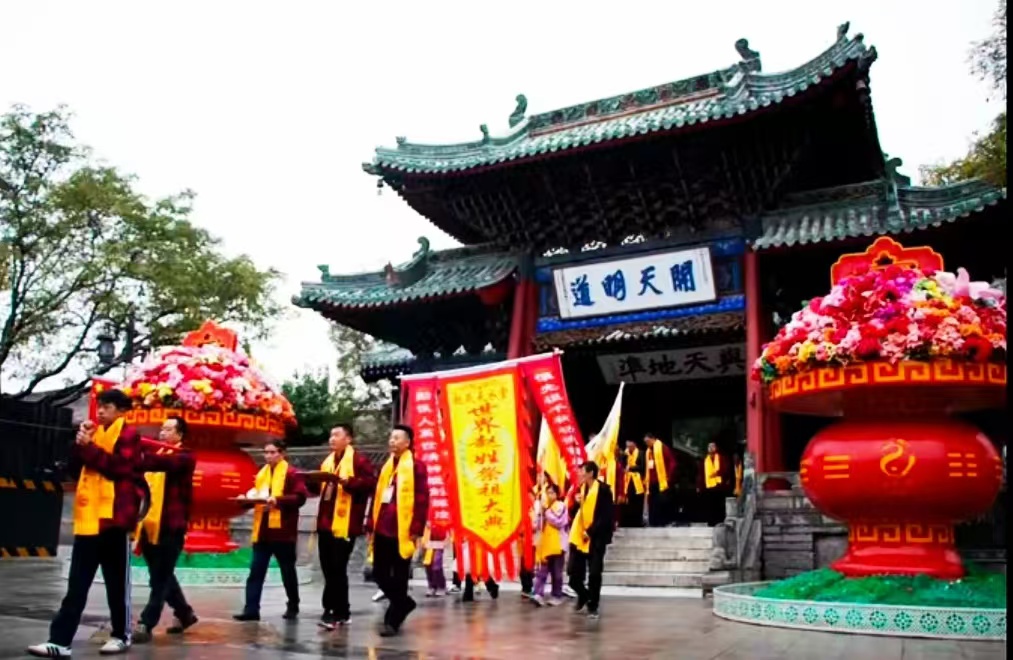上午九點,趙氏天水堂內旌旗招展、鼓樂同鳴。趙氏宗親代表隊及舞獅隊、鑼鼓隊、嗩吶隊、腰鼓隊等前往伏羲廟拜謁中華人文始祖伏羲。隨后,祭祖大典在古樸大方、莊嚴肅穆的趙氏天水堂正式拉開帷幕。
