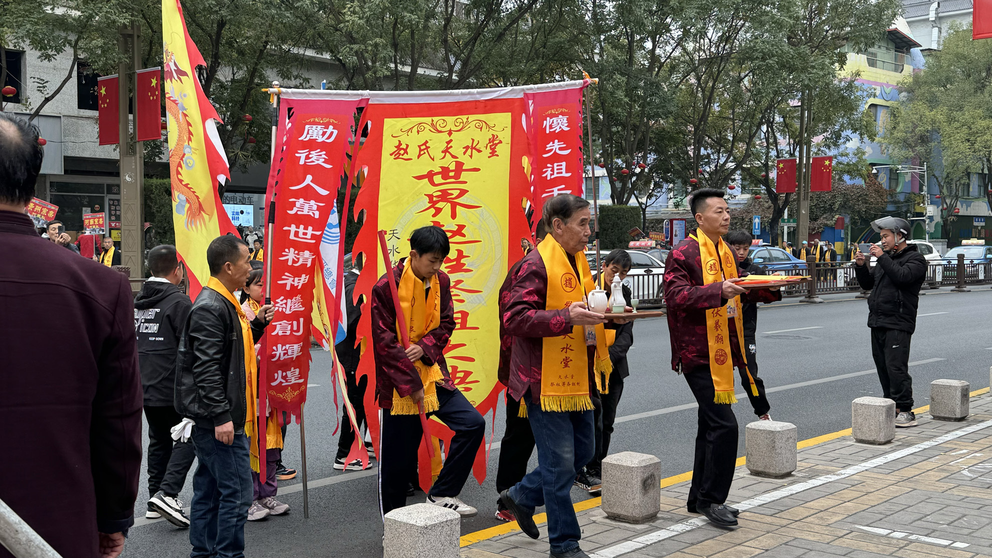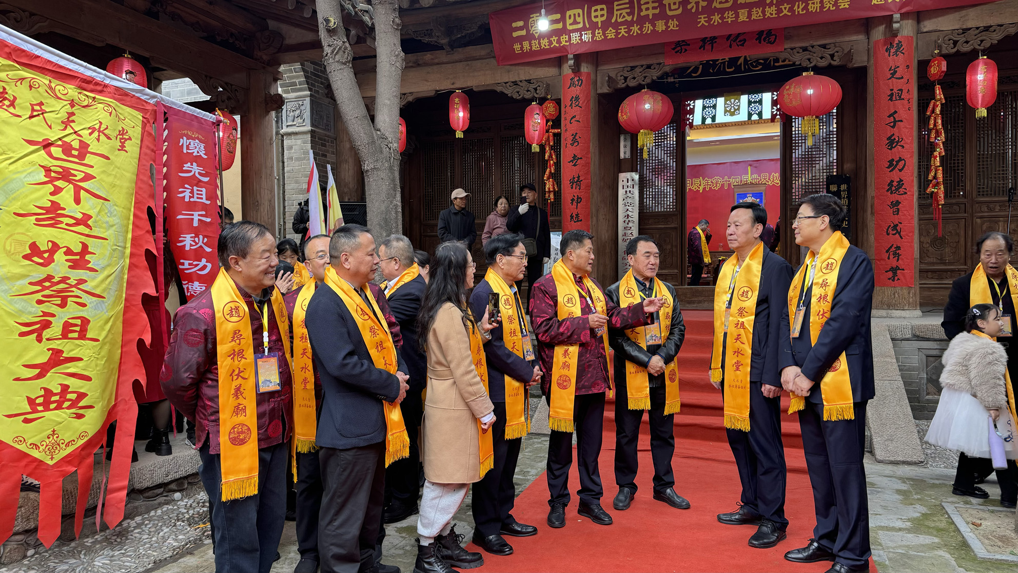 11月10日上午,由世界趙姓文史聯研總會天水辦事處、天水華夏趙姓文化研究會承辦的2024(甲辰)年世界趙姓祭祖大典在秦州區解放路趙氏天水堂舉行。來自世界各地的趙氏后裔代表相聚天水,首先在伏羲廟拜謁中華人文始祖伏羲,隨后于趙氏天水堂舉行了祭祖大會活動,尋親祭祖,祈福納祥。