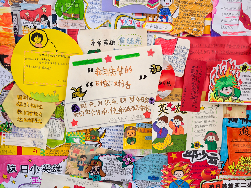 早上八點,孩子們手執鮮艷的國旗,踏著《歌唱祖國》《我們是共產主義接班人》的歌聲步入校園。在校門口設立的“我與先輩的時空對話”打卡墻成為情感表達的窗口,孩子們用真摯的語言寫下對先輩的崇敬與承諾:“我們會讓祖國更強大”“我們會像愛護紅領巾一樣愛護祖國”。一字一句,跨越時空,傳遞著少年對歷史的回應和對未來的擔當。