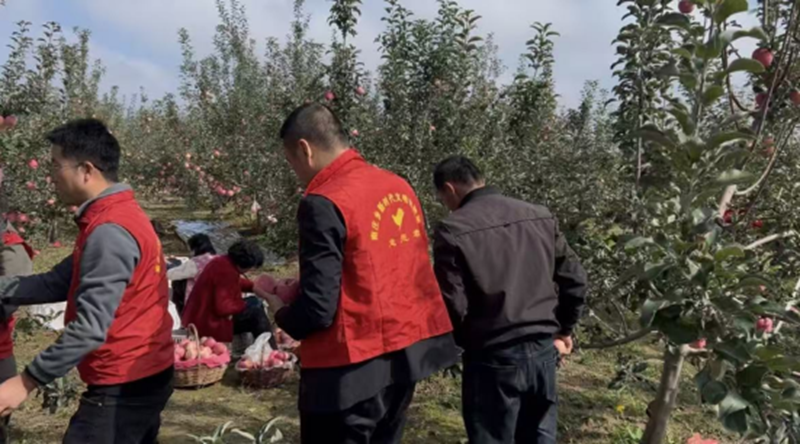 在果農岳世德家的果園里,平日里伏案工作的干部職工們,此刻化身“采摘工”,忙碌的身影在果樹間穿梭,鮮艷的紅馬甲與紅蘋果互相映襯。