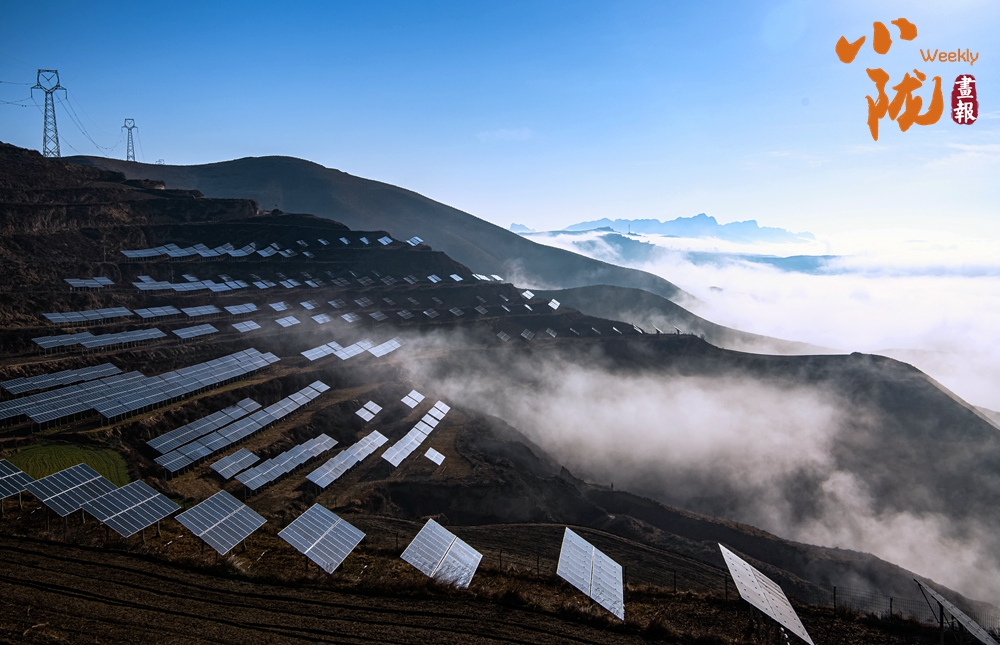 成排的太陽能光伏電板如藍色鱗片,鱗次櫛比地鑲嵌在山坡上,與天際悠悠的流云、遠處起伏的山巒相映成趣。科技之美與自然之韻在這里悄然融合,共同繪就出一幅綠色發展新畫卷。
