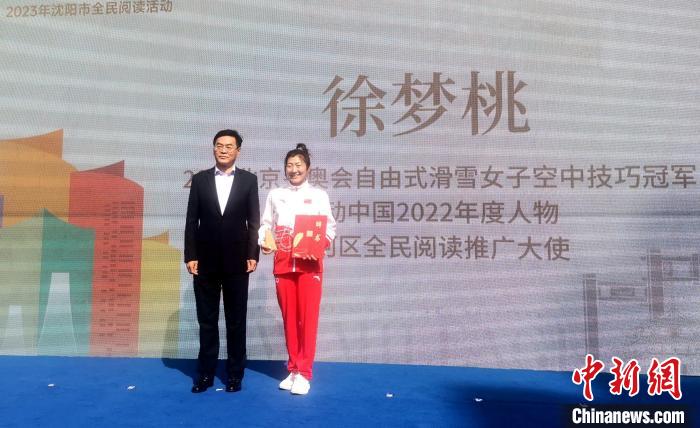 沈陽市沈河區區委書記林宇航向徐夢桃頒發“全民閱讀推廣大使”聘任書。 趙桂華 攝