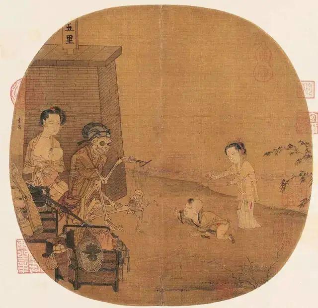 在這幅團(tuán)扇大小的畫面中,李嵩描繪了一幅傀儡戲的演出場(chǎng)景,一幅披衣戴帽的大骷髏,操縱著線板,指揮著一幅小骷髏在表演各種動(dòng)作。一個(gè)嬰兒好奇地爬向那個(gè)表演中的骷髏小傀儡……活人與骷髏、生與死,同時(shí)出現(xiàn)于畫面中,在中國(guó)古畫里是極罕有的,也因此引起了后世的種種猜測(cè)解讀。