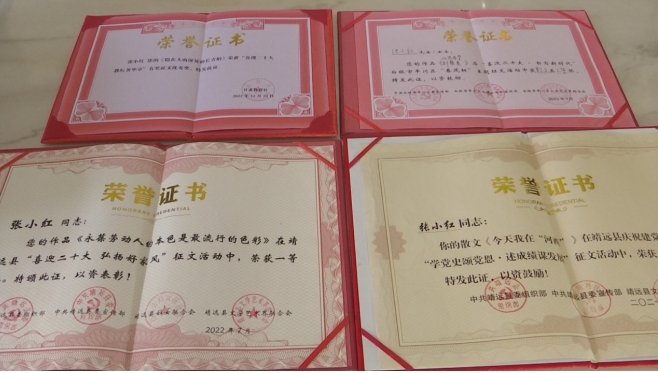 一分耕耘,一分收獲,機會總給有心人。如今,張小紅加入了靖遠縣作家協會、白銀市作家協會、白銀市文藝評論家協會成為了會員,也增選為靖遠縣政協委員。她的作品散見于《白銀文學》《烏蘭》等報刊雜志以及“靖遠作協”“隴上風情”“黃土情文學”等文學公眾號;部分作品榮獲靖遠縣建黨100周年“學黨史頌黨恩·述成績謀發展”征文二等獎,“喜迎二十大·教壇著華章”《未來導報》有獎征文優秀獎等……