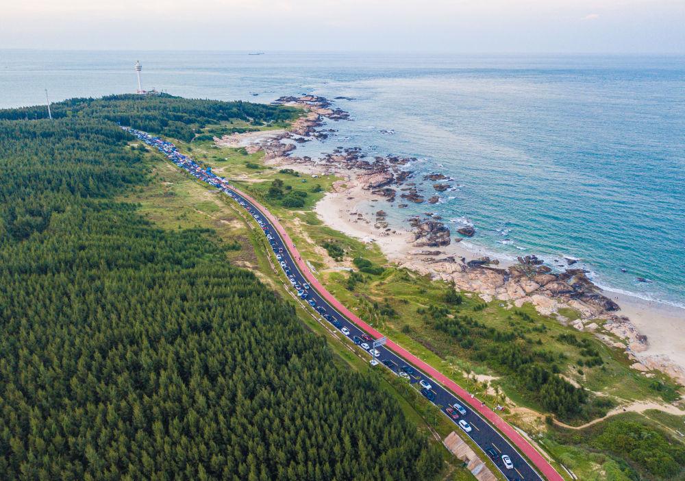 ↑2023年10月4日拍攝的海南環島旅游公路文昌段景色和自駕游車輛(無人機照片)。新華社記者 蒲曉旭 攝