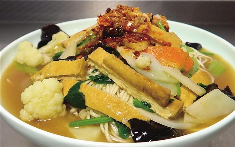 搭配吸滿(mǎn)醬汁的油炸凍豆腐,再淋上一口酸辣蒜汁,這種來(lái)自碳水的誘餌很難令人抵抗。蘭州鹵面的面條與牛肉面一樣,都是技藝精湛的拉面師傅親手拉出來(lái)的,湯汁用油炸凍豆腐和多種素菜混以牛肉面原湯勾芡,文火慢煮,再澆到新出鍋的面條上。