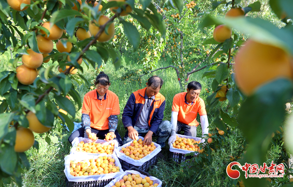 7月15日,甘肅省張掖市甘州區一專業合作社的特色林果種植基地內,金黃色的杏梅掛滿了枝頭,工作人員正在采摘成熟的杏梅。
