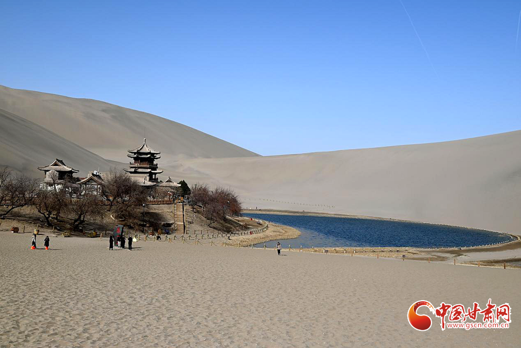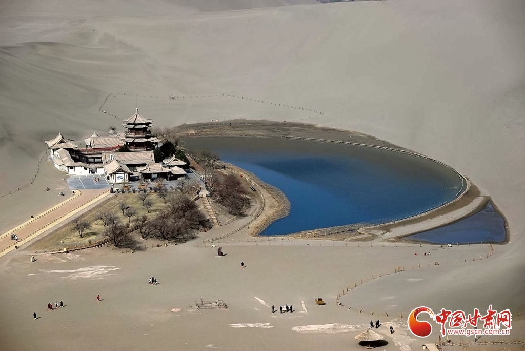 3月8日,隨著氣溫回暖,絲路明珠敦煌迎來早春勝景。鳴沙山環抱中的月牙泉冰雪消融,一泓碧水宛如翡翠鑲嵌在大漠之中,呈現出"沙水共生"的奇觀。