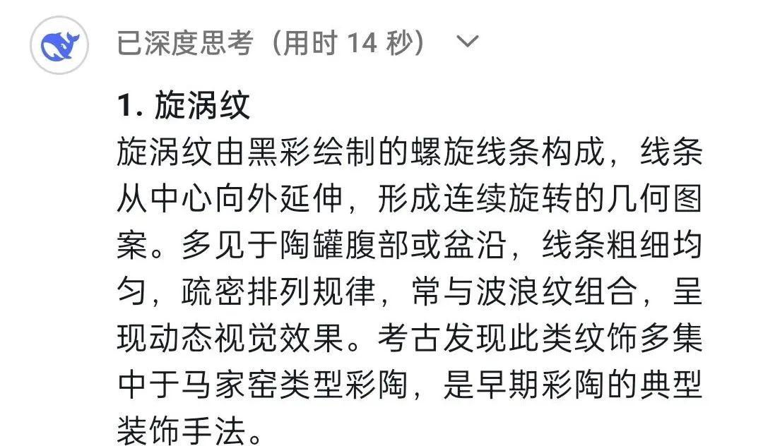 DeepSeek:馬家窯文化作為人類文明長河中一顆璀璨的明珠,因最早發現于甘肅省臨洮縣馬家窯村而得名,它被認為是仰韶文化向西發展的延續,它展現了黃河上游先民的創造力,更是史前人類與自然對話、與社會共生的見證。