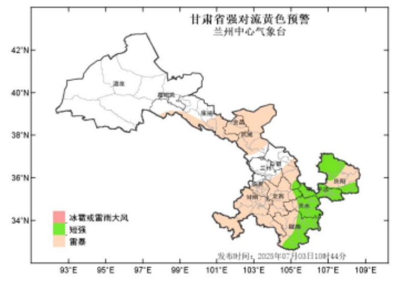 蘭州中心氣象臺(tái)2025年7月3日10時(shí)44分繼續(xù)發(fā)布強(qiáng)對(duì)流黃色預(yù)警:預(yù)計(jì)未來(lái)24小時(shí),張掖、金昌、武威、蘭州、白銀、甘南、臨夏、定西、隴南、天水、平?jīng)觥c陽(yáng)等州市有雷暴,其中隴南、天水、平?jīng)觥c陽(yáng)等市部分地方及白銀、定西兩市局部地方有短時(shí)強(qiáng)降水,最大小時(shí)雨強(qiáng)20-60mm;隴南、天水、平?jīng)觥c陽(yáng)等市強(qiáng)降水在未來(lái)24小時(shí)內(nèi)多發(fā),白銀、定西主要強(qiáng)降水時(shí)段在4日2-8時(shí)。請(qǐng)注意防范!