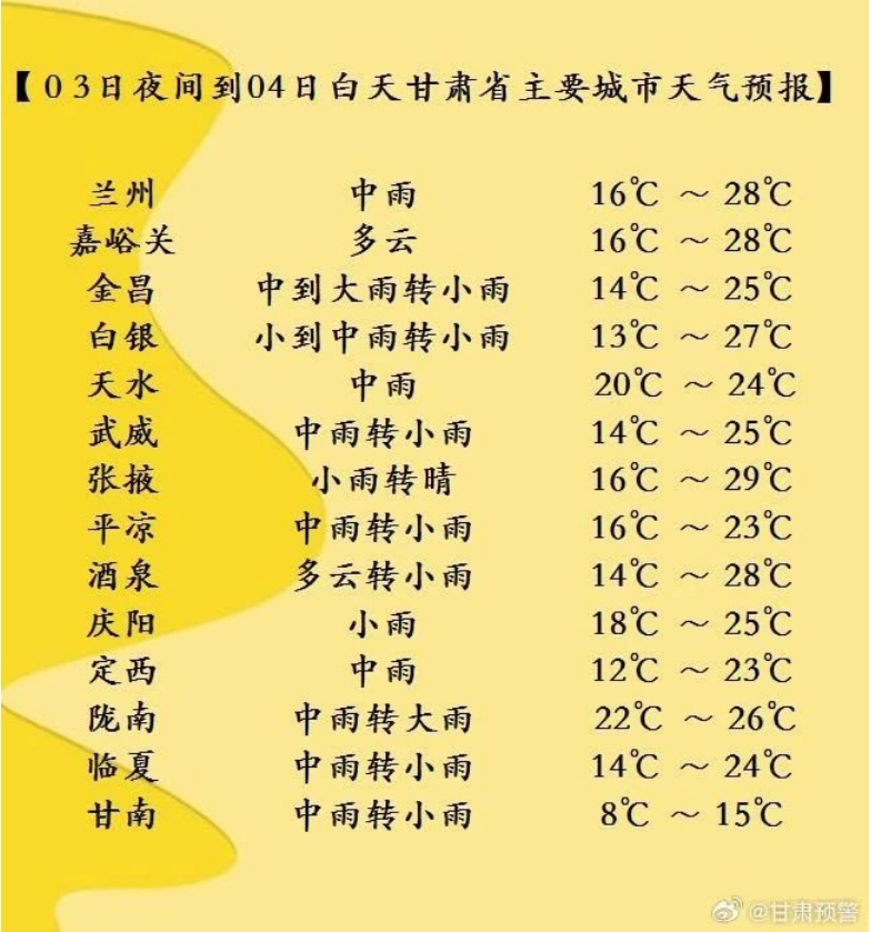 今天夜間到明天白天(7月3日20時(shí)-7月4日20時(shí)),酒泉、嘉峪關(guān)、張掖三市多云間陰,局部地方有小雨,祁連山區(qū)有中到大雨;省內(nèi)其余地方陰有小到中雨,其中隴南、天水、平?jīng)觥c陽(yáng)等市局部地方及定西、甘南兩市州東部、白銀市南部有暴雨。