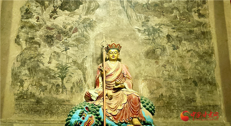 這幅壁畫繪于大佛殿內(nèi)大佛身后墻壁,色彩雖已斑駁,卻仍難掩其藝術(shù)價值,是大佛殿內(nèi)時代較早、藝術(shù)水準(zhǔn)極高的作品。它距地面高1.55米,上下兩端用墨線勾出邊欄,邊欄內(nèi)繪纏枝牡丹點綴;《西游記》故事圖居于正中,殘長約4.4米,殘高約2.9米,面積約12.7平方米,壁畫前今塑有地藏王菩薩像一尊。壁畫由“取水子母河”“道昧放心猿”“大戰(zhàn)紅孩兒”等多個獨立故事組成,畫面里險山怪石、古木溪水、云霧火海錯落交織,而師徒四人的分工設(shè)定始終清晰:豬八戒挑行李、沙僧牽馬、孫悟空持金箍棒護(hù)送,這份“固定分工”讓豬八戒的勤勞形象貫穿全程。